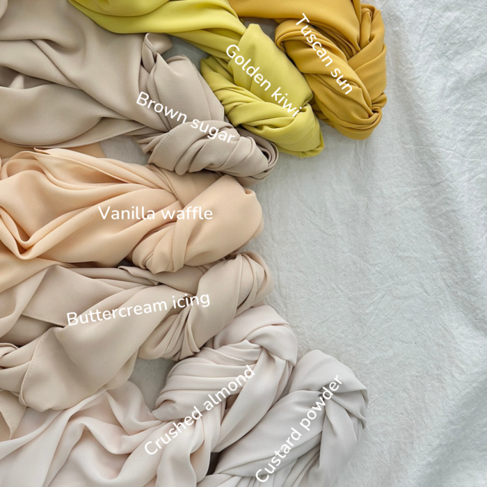 Chiffon Luxe is a combination characteristic of chiffon georgette and chiffon crepe. Material is soft, drapes down beautifully with just a little bit stiffness for easy shaping. Cooling and thin with 90% opacity making it a very suitable choice to be worn all day long